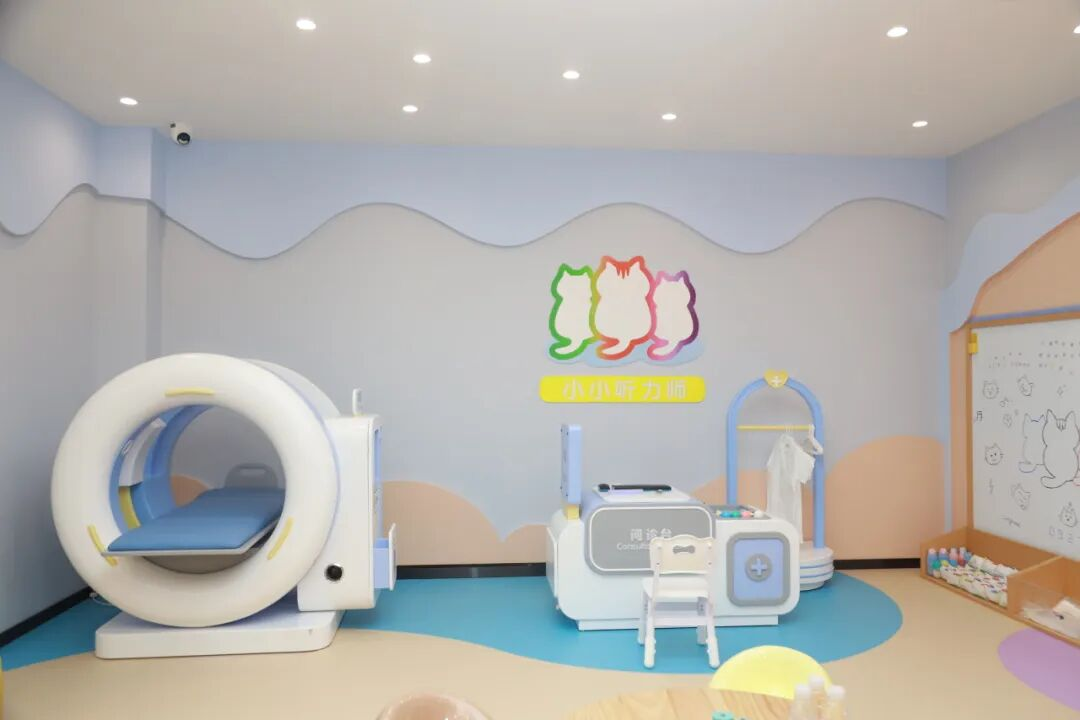 馆内配置国际领先的检测设备,集成尔听美全系列听力评估系统,可完成从声导抗、OAE到ABR、TB-ABR、ASSR的全方位主客观听力测试,实现精准化评估与干预。同时,三只懒猫(西安)听觉言语科技馆还与斯达克中国共同打造了“童梦淘园”亲子互动体验区,将听力康复与情景游戏有机结合,让孩子在轻松愉悦的氛围中提升听觉与言语能力,增强康复过程的参与感与持续性。