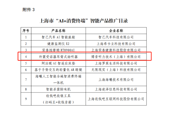 为贯彻落实《上海市加快推动“AI+制造”发展的实施方案》,推动人工智能与实体经济深度融合,上海市近期正式发布了《2025年度“AI+制造”智能产品推广目录》。经严格遴选,博音旗下创新研发的外置受话器耳背式助听器成功入选,标志着公司在智能技术产业化应用领域再次获得权威认可。